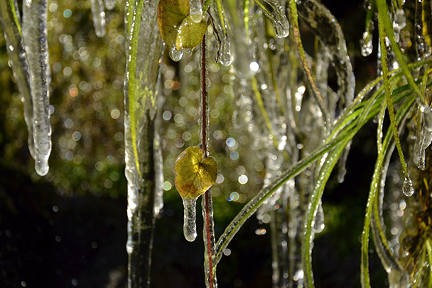 背景の暗い所だったので、露出補正をマイナス(-1.3)にして、氷部分の色が飛ばないように注意(感度を上げ、手ブレにも注意した)。背景や周囲がやや煩雑な環境でしたが、まるで氷に包まれているような小さな葉をメインに捉えました。