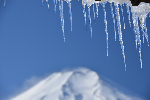 雪の被った富士山をメインにするのではなく、あえて軒下に下がるつららを主役にし富士山は脇役に。望遠レンズの「圧縮効果」を活用し、つららと富士山を近づけて見せています。