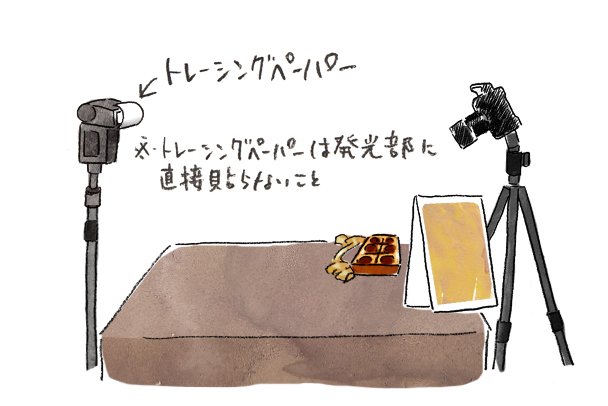 - スピードライトにトレーシングペーパーを貼って強い光を和らげる。発光部分に直接貼らないように注意。スピードライトに付属のバウンスアダプターでも代用可能