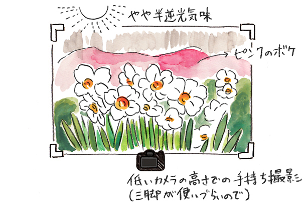 - 水仙の花の高さまでカメラを下げた