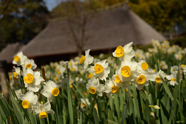 水仙は日本的なイメージを持った花なので、何となく懐かしい雰囲気のある、茅ぶき屋根を意識的に画角に入れて、イメージを膨らませてみました。