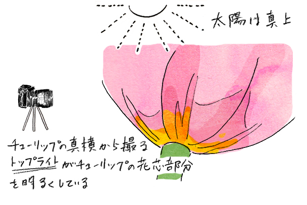 多くの花が咲く春の植物園から受けるイメージは「陽光」と「彩り」です。トップライトの時間帯に撮影したため、お椀形のチューリップの中に光が当たり、かわいらしさと春の光が強調されました。マイクロレンズで近づいて真横から一輪を大きく撮ったことで、背景のボケも大きくなりイメージ通りの作品に仕上がりました。