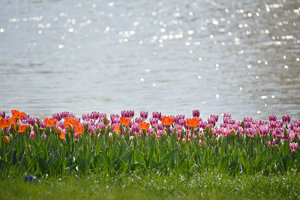 水辺の春とリズム感を表現するために、背景の水面が光るのを待って撮影しました。チューリップを横一列に並べるようにするのがポイントで、五線譜上の音符のようなリズムが表現できました。三脚を使い画面が傾かないよう注意します。