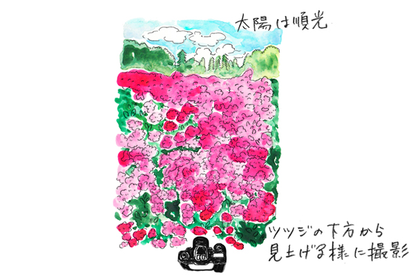 低木のツツジやサツキを写す時は、背景に地面が写りこまないようアングルに注意します。広角レンズで被写体に近づき、見上げるようなアングルで撮影することで地面が写り込まず遠近感も強く表現できます。タテ位置の構図にすることで奥行きと高さを出し、臨場感あふれる作品になっています。順光になる位置からの撮影です。