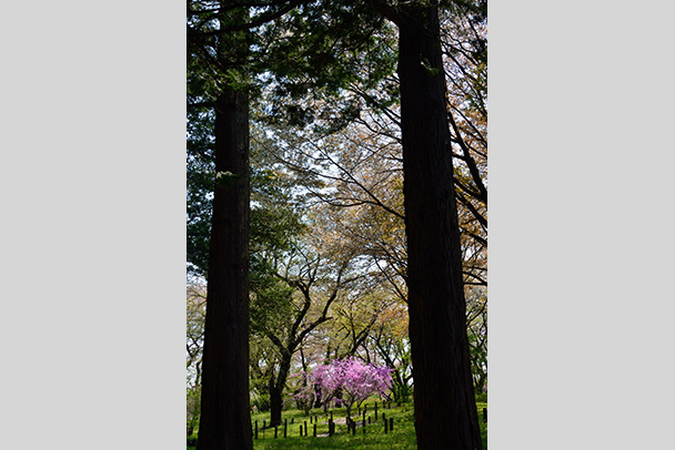 むせかえるような新緑の中にツツジの色が鮮やかに浮かび上がっています。雨は花木たちに精気を与え、いきいきとした雰囲気を醸し出してくれます。赤と緑だけでは単調すぎるため、画面の上に太い幹を入れ変化をつけました。雨上がりのしっとり感がポイント。