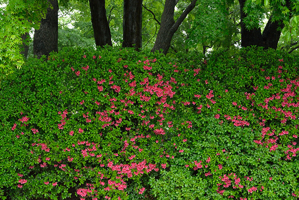 初夏を迎えるこの季節、公園や植物園の主役はツツジやサツキです。低木の花木ですがぎっしりと密集して咲く姿からは、花木たちの歓びの声が聞こえてきます。咲いている場所があまり広くなくとも、レンズの選択や撮影時ポジション、アングルの工夫により、豪華で広がりのある「ツツジが咲く様子」を表現できます。