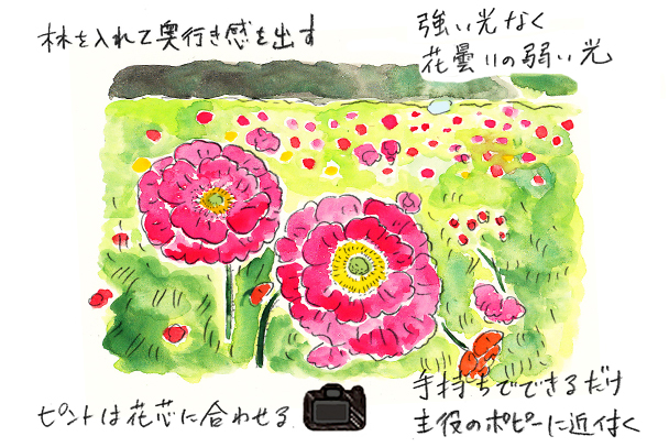 - 奥行き感を出すため背景に林の一部を入れた構図