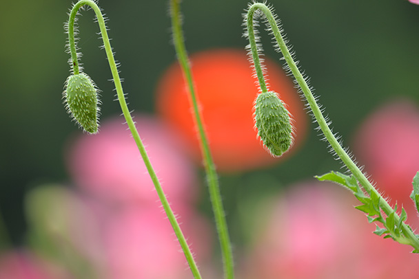 花もよいのですが、産毛の様子を逆光気味の光で狙うときれいです。背景は黒でもよいのですが、望遠レンズのボケ効果を狙い、華やかな花々を配してみました。蕾もまた絵になります。