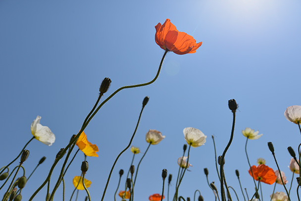 ひょろひょろと伸びた茎の様子もまたポピーの特長です。低い位置にカメラを構えて、快晴の青空にポピーを抜いた感じで撮影しています。