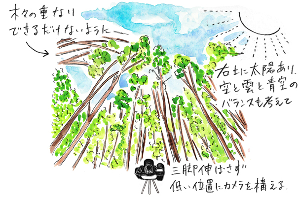 右上に太陽があるタイミングでの撮影。空の雲と青空のバランスにも留意しながら、木々の重なりがなるべく少ないところを選びました。