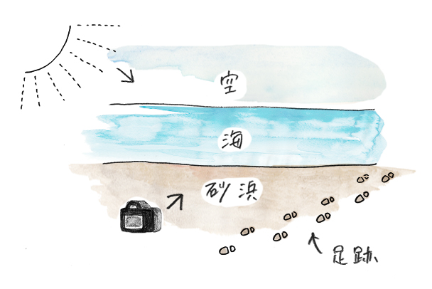 砂浜や空に浮かぶ雲、波の白と海のブルーグリーンがストライプのように広がる一枚に仕上がりました。