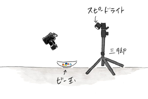 - 半逆光の状態にするためスピードライトを左斜め上に配置