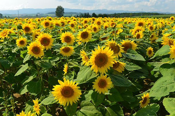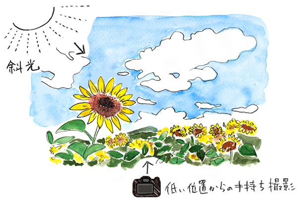 盛夏の青空と白い雲に似合う花といえば、やはりヒマワリでしょう。夏の光と暑さを全身で浴びて伸びていく姿には、何か力強ささえ感じられます。ちょっとしたひと工夫でワンステップアップした作品を撮ることができます。