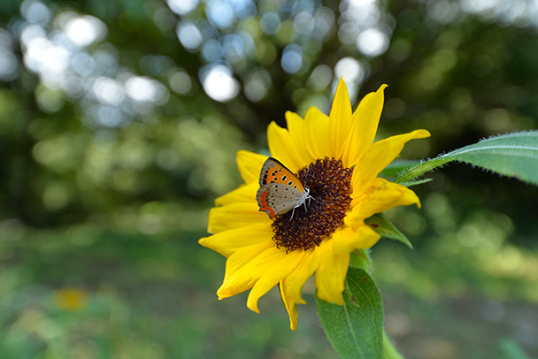 広角レンズを使い、できるだけとまっている蝶に近づいての広角接写です。背景の左上に出ている木洩れ日の玉ボケがアクセントです。