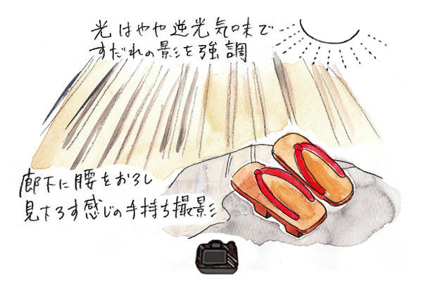 やや逆光気味の条件下ですだれの影を強めに出しています。また光が当たっている所を強調するために、アンダー(-1.0)の露出補正をしました。
