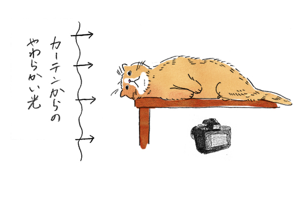 - 部屋の中も写すことで奥行きを演出しつつ、背景は絞り開放でぼかしネコを印象的に
