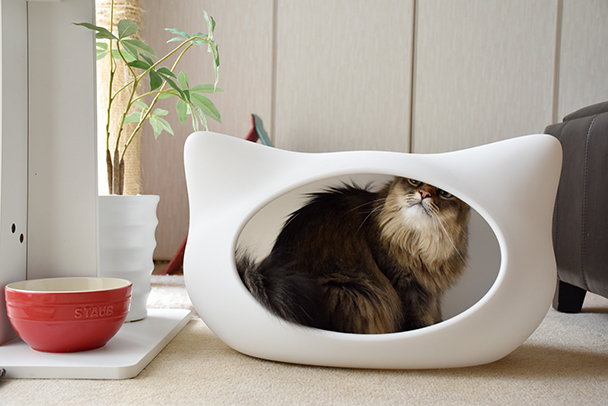 狭い空間はネコがリラックスできる場所のひとつ。お気に入りの寝床で得意げな表情。カラフルな水飲みボールやグリーンなどを配置し空間も見せた1枚。