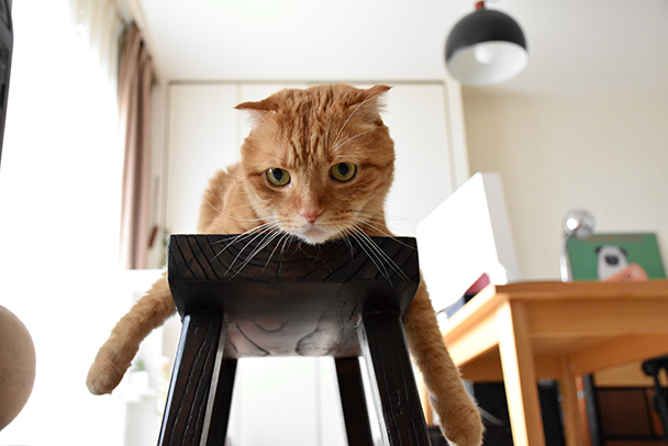 椅子の上で前脚を広げている様子。やや下から狙ってポーズの面白さを見せました。広角で部屋の天井や建具に対してほぼ正面から撮影したことで、上に向かって収縮する構図が強調されています。