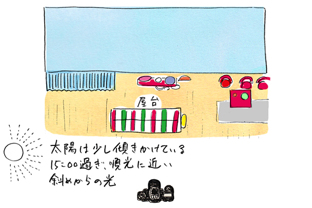 色使いのかわいらしさをより印象的に見せるため、あえて平面的に表現。正面に立って撮影しています。太陽が少し傾きかけた15時過ぎに、順光に近い斜めからの光がきているタイミングに撮りました。