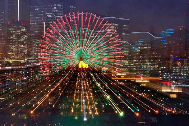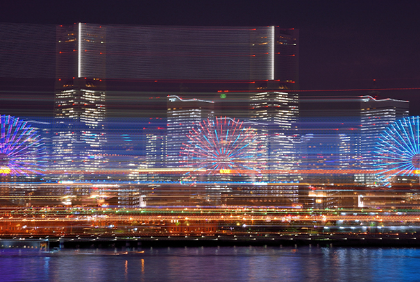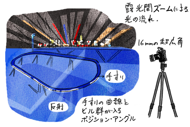 桟橋上部はブルーの照明に照らされ、立ち並ぶビル群は蛍光灯やLEDで光り輝き、まるで未来都市のような印象を受ける風景です。露光間ズームでビル群の光は直線に、手前の手すりは曲線になるよう、ポジションとカメラアングルを決めました。ブルーの光とビル群の光量もポイントです。作品上部、ビル群の手前には露光間ズームによる水の流れも映し出すことができました。