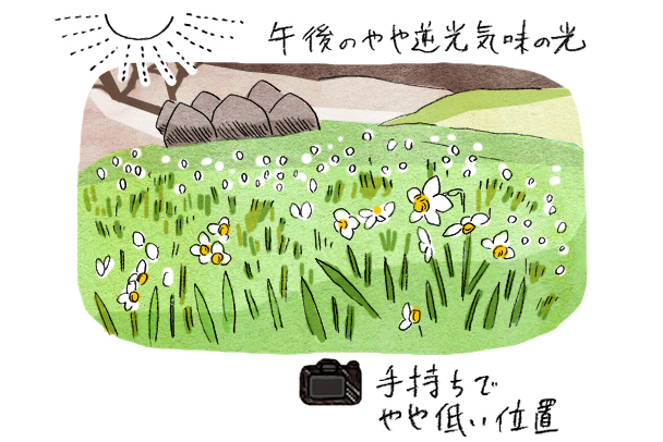 - 広角レンズでたくさん咲いている群落の様子を狙う
