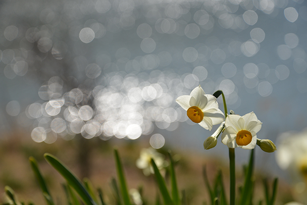 春はまず光からやってきます。中望遠レンズを使い、背景にある水面のキラキラした丸ボケを大きくしています。主役の水仙の位置と丸ボケのバランスを考えて切り取りました。