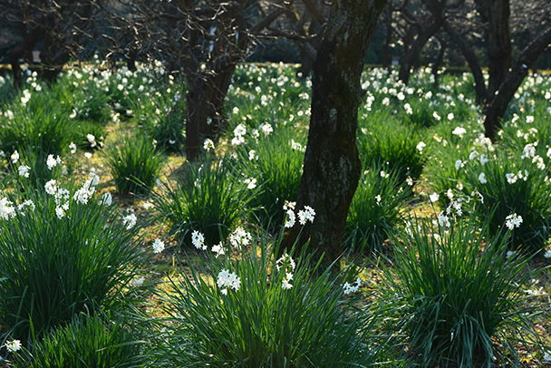 春を予感させる午後、暖かいやや逆光気味の光の中、道沿いに咲き乱れる水仙の群落は甘い香りに包まれていました。もうすぐやってくる季節への期待が伝わってきます。背景にわらぼっちを配し田舎の様子を表現しました。カメラは手持ちでやや低い位置から撮影しています。