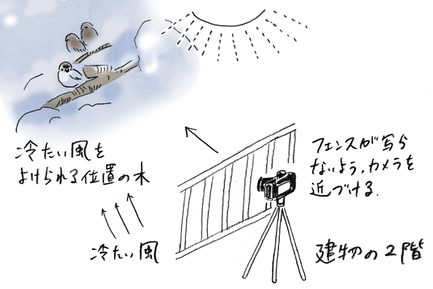 スズメが寒さを除けるために来る松の木を発見。そういったスポットを探し出すことが重要です。