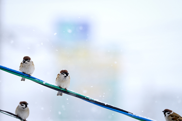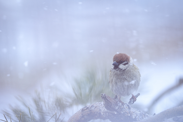 誰もが目にする身近な鳥であるスズメ。よく見ると彼等は、とても表情豊かで愛らしい被写体です。寒さに体を膨らませたり、吹雪に思わず目を細めたり…。雪景色の中ではその白さを背景に、被写体の魅力がより浮かび上がってくるように感じられます。