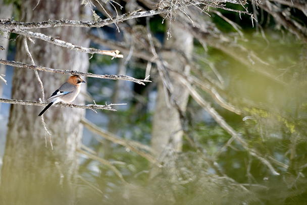 凍結した湖畔の枝にとまったミヤマカケスを、枝の間から狙いました。白い地面に反射した陽光が、天然のレフ板効果となって、ふわっとした小鳥の身体を下から照らし、愛らしさが増しています。
