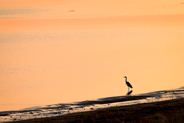 逆光気味の夕焼けに照らされた水面を背景に被写体をシルエットで捉え、幻想的な雰囲気に。アオサギも市街地でも見られる身近な鳥です。