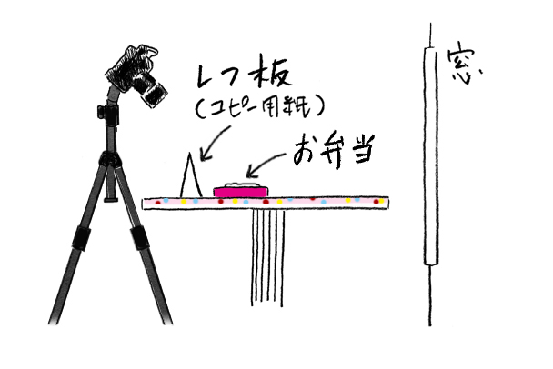 - お弁当の手前に強い影が出るため、白いコピー用紙をレフ板代わりに使用
