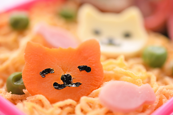 頑張って作ったお弁当のキャラクター。せっかくなので、アップでしっかり撮りましょう。小さなお弁当の中にある、楽しい空間を作品にできます。