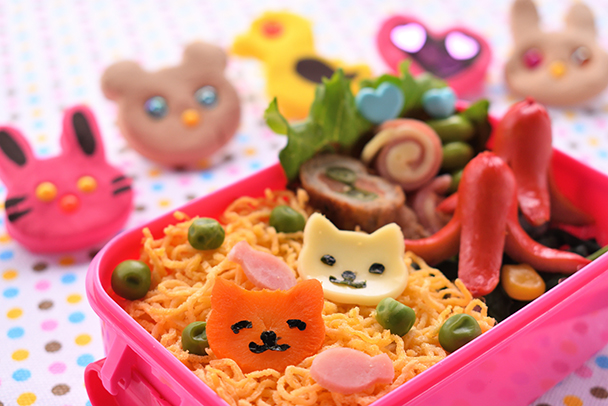 - 可愛らしさを演出するため、お弁当の下に敷くランチョンマットやカトラリーはカラフルなものを用意