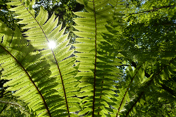 上に向かって垂直に伸びたシダの葉を真横から狙います。葉の間から覗く太陽を入れワンポイントにしてみました。逆光状態になるため露出はオーバー(+2.0)にし、緑の葉を表現しています。