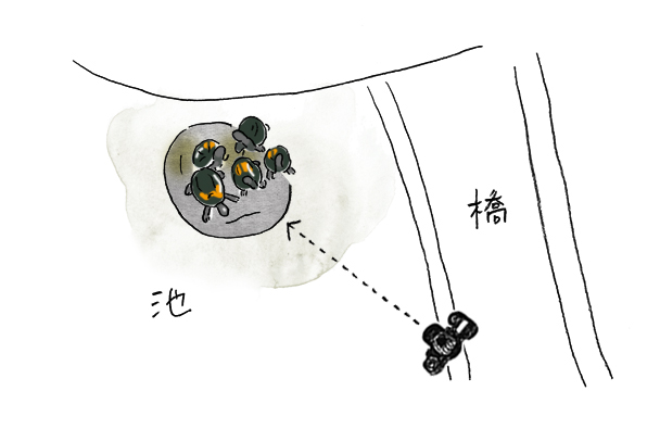 橋の上から泳いでいる亀と目が合ったため、下から見上げた亀の愛らしい表情にフォーカスしました。