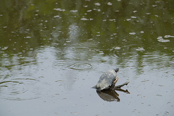 水面にポツンと突き出た木の枝に登った亀。周りの水面の波紋を入れて引き気味にフレーミングしてみました。