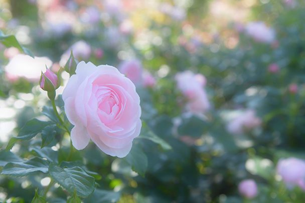 背景には光が当たっていますが、手前にある主役のバラには直接の光は当たっていません。露出をオーバー気味にかけ、やさしい色合いのバラの雰囲気をソフトフィルターで強調してみました。花の向いている右側を少し広めに切り取っています。