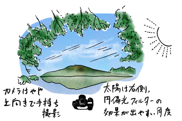 カメラは手持ちでやや上向きになる位置から撮影。太陽が右側にあり、円偏光フィルターの効果が出やすい位置を探すようにしてください。