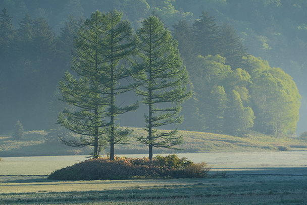 もやの中、ポイントになりそうな3本の新緑のカラマツを主役にしました。背景の木々にも朝日が当たり、水分を感じさせる雰囲気を狙っています。70-200mmのレンズに2倍のテレコンバーターを使用し、270mmの所で撮影した作品です。