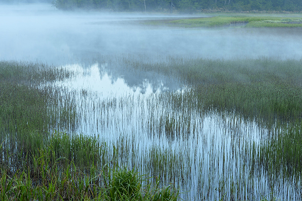 水面を覆うように広がっていたもやが気温の上昇と共に流れて動き始めました。近景の草や中景の様子も徐々に見えてきたタイミング。無音の光景についつい見とれてしまいそうでしたが、早々に絵が変わってしまうので急いでシャッターをきりました。