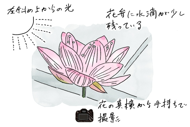 花弁に少し残る水滴。やわらかい光が差し始め花弁の透明感がきれいです。色のグラデーションを美しく撮りたかったため、真横からカメラを手持ちして近づき、この部分だけ大きめに狙いました。思い切ったプラス(+2.0)の露出で背景を飛ばし気味にしています。左斜め上に太陽があるタイミングの撮影です。