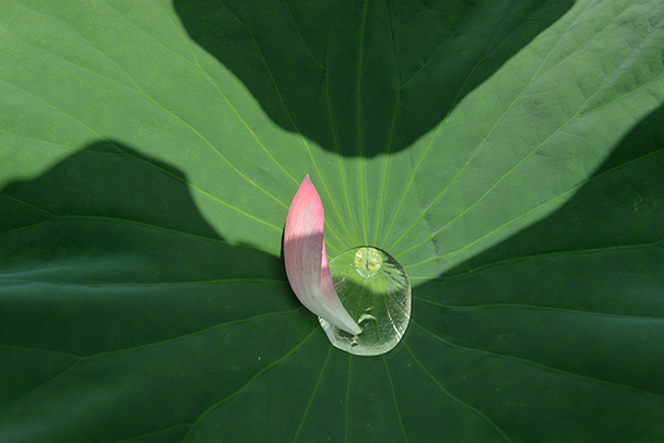 前日の雨しずくがハスの葉に残っていた所に花弁が1枚落ちていました。色と形の質感の対比が面白かったのに加え、葉の陰が独特の形をしていて魅力的だったので、思わずおさえた一枚です。