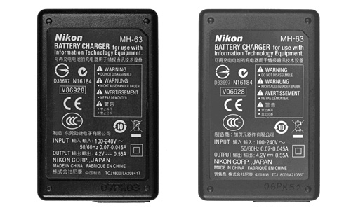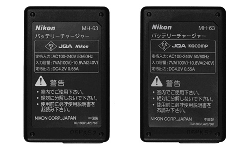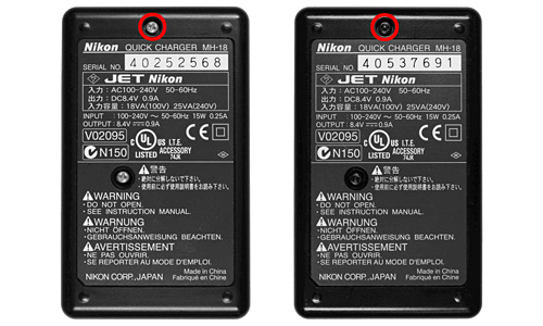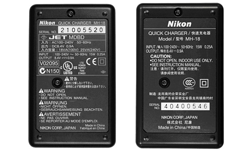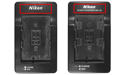 模倣品(QUICK CHARGER MH-18の印字がない、Nikonロゴの書体が異なる、など