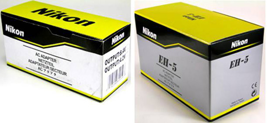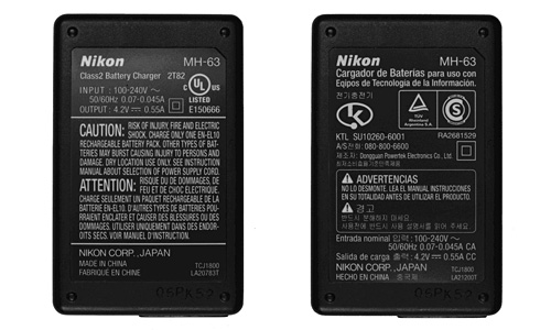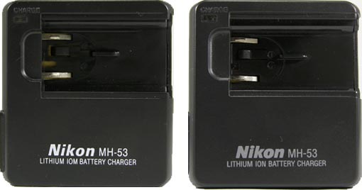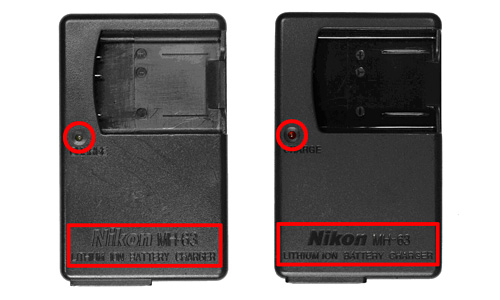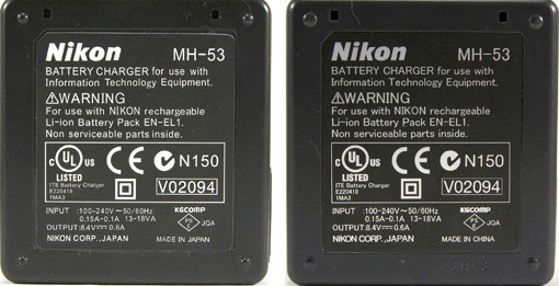 模倣品(非点灯時のCHARGEランプの色および、Nikonロゴなどの刻印の書体やサイズが異なるなど)