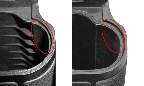 模倣品はプラスチック製で重量が軽く、表面仕上げも異なる。外観上の主な相違点は下記のとおり。
