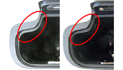 縦位置シャッターボタンの表面に光沢があり、ロックレバーのLマークの刻印の位置が異なる。