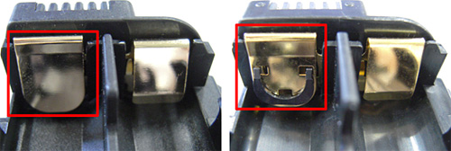 単3形電池ホルダー MS-D11 の正極(+側)接点端子(三か所)の形状が異なる。