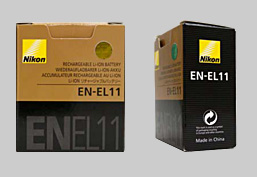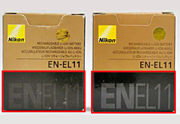 EN-EL11 の化粧箱外観と表面および裏面(左側が模倣品、右側が純正品)