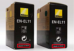 模倣品:表面下部の黒い部分のEN-EL11の視認性などが異なる。側面下部が、Made in Japan となっている。